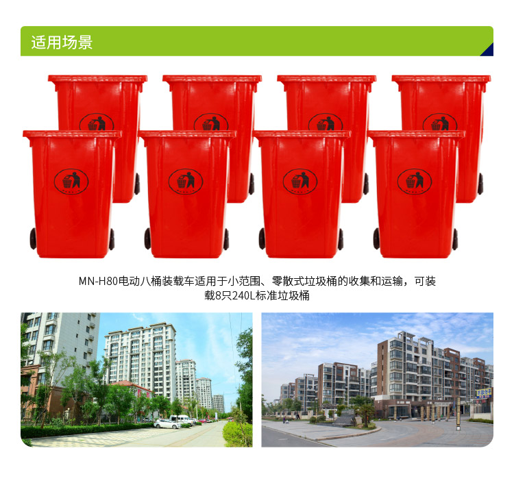 MN-H80电动八桶装载车适用于小范围、零散式垃圾桶的收集和运输,可装载8只240L标准垃圾桶