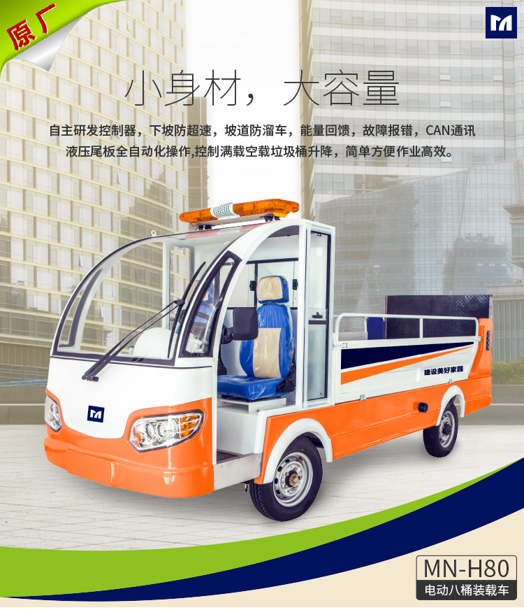 MN-H80是应用明诺特色制造工艺的电动四轮八桶车,适用于小范围、零散式垃圾桶的收集和运输,可装载8只240L标准垃圾桶。
